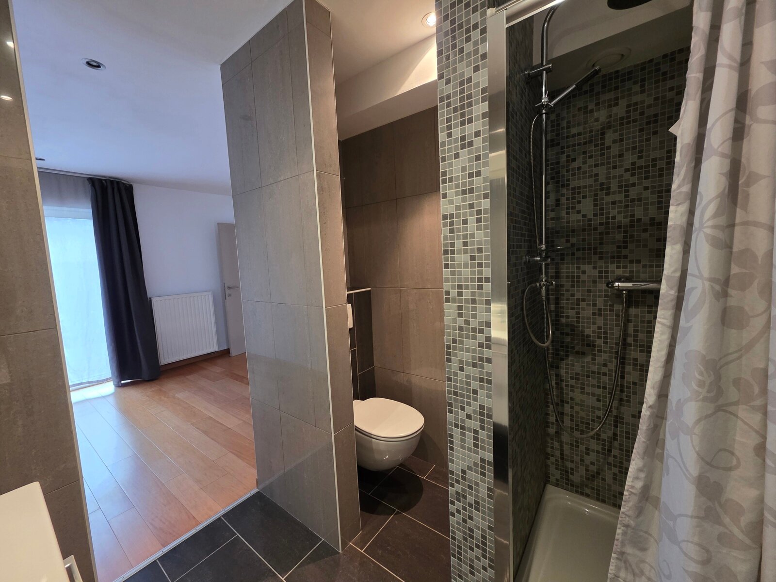- Badkamer (2m x 2,50m = 5m²): geïnstalleerd badmeubel met enkele lavabo, onderkast, spiegel, kolomkast, douche, hangtoilet, wandbetegeling, tegelvloer.
