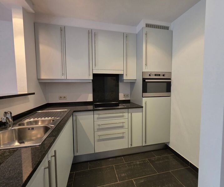 - Keuken (2,50m x 3m = 7,50m²): geïnstalleerde keuken met onder-bovenkasten, lades, inductiekookplaat, dampkap, koelkast, oven, tegelvloer.
