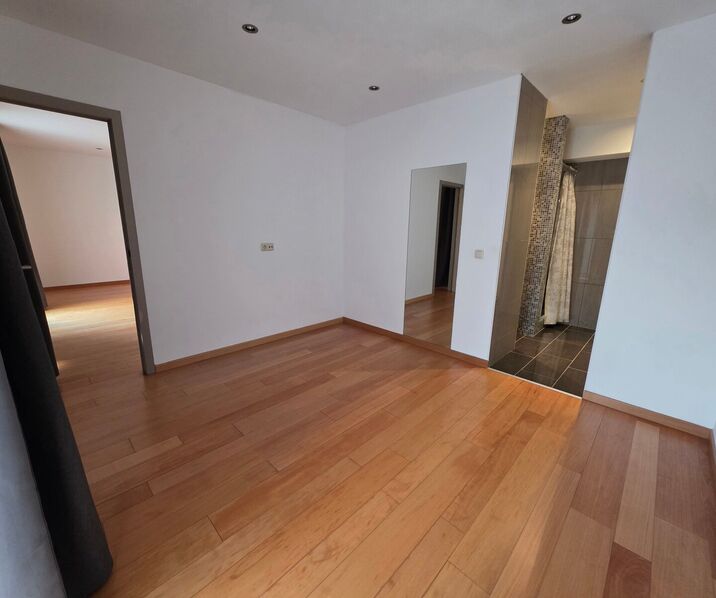 - Badkamer (2m x 2,50m = 5m²): geïnstalleerd badmeubel met enkele lavabo, onderkast, spiegel, kolomkast, douche, hangtoilet, wandbetegeling, tegelvloer.