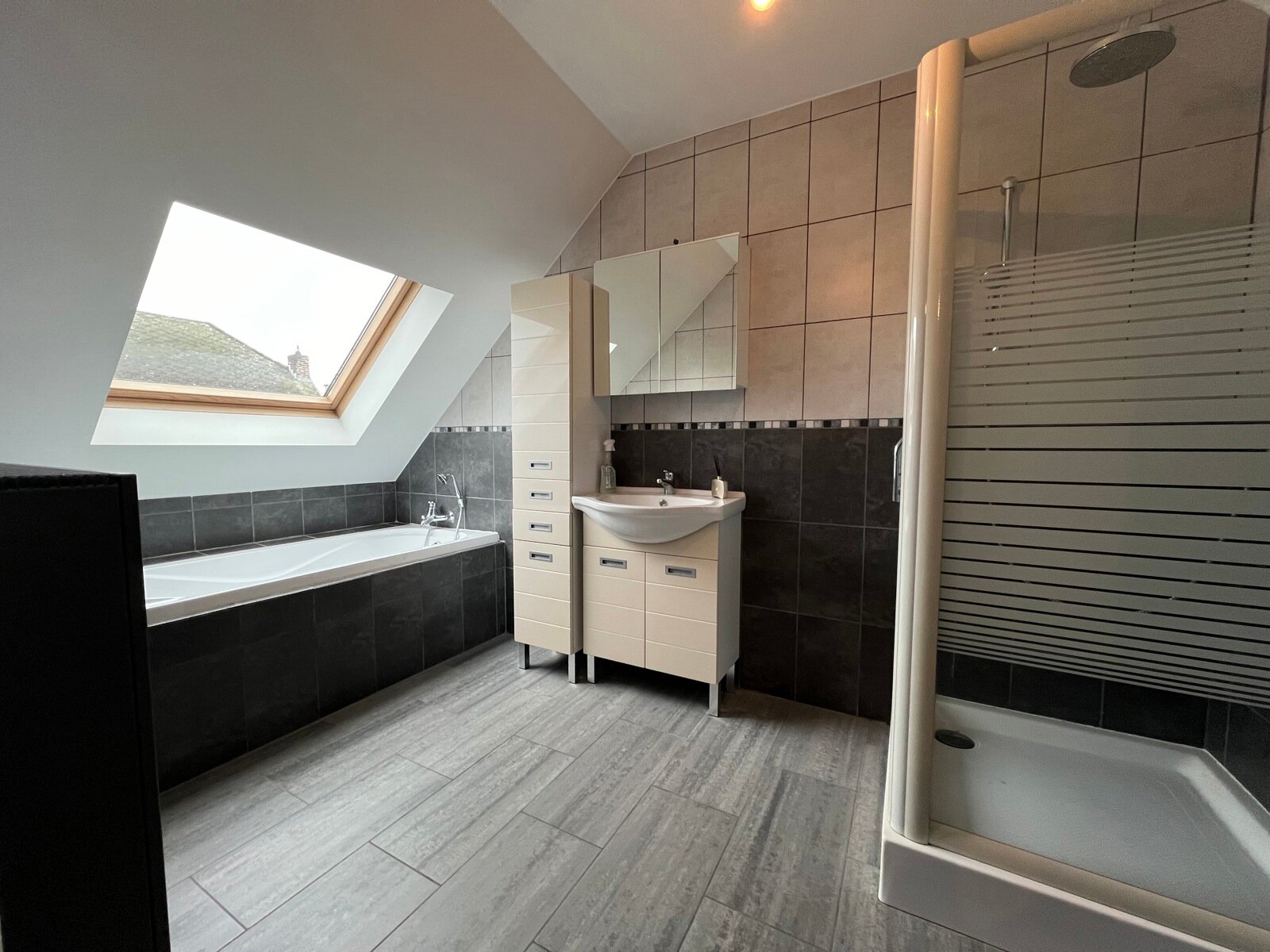- Badkamer (2,10m x 4,00m = 8,40m²): badkamermeubel (enkele lavabo, onderkast en kolomkast), ligbad, douche, aansluiting wasmachine, tegelvloer.