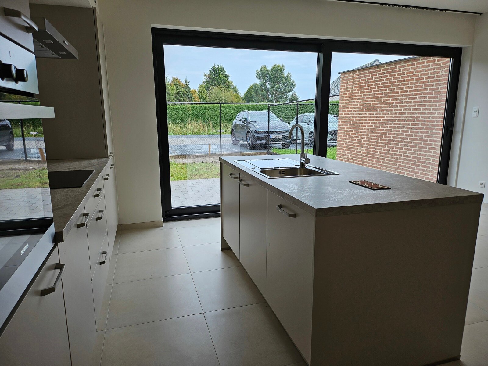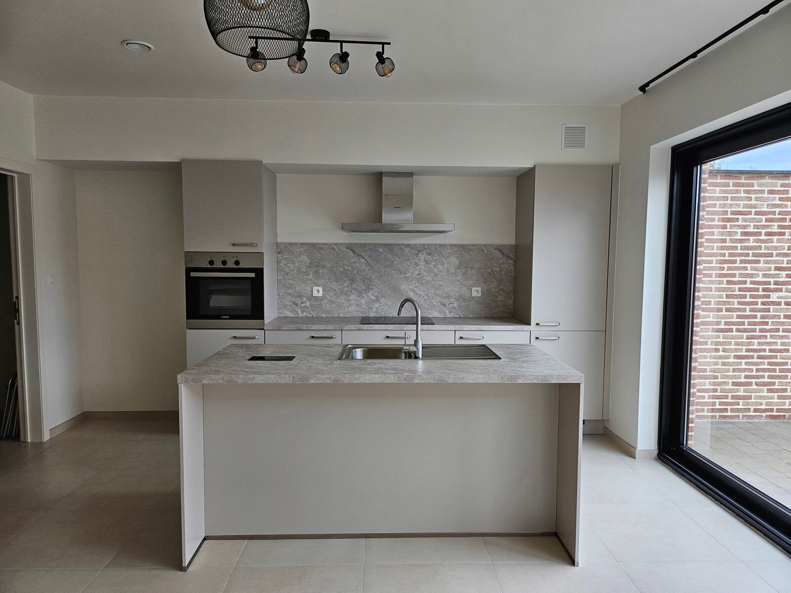 - Keuken (5,50m x 5,00m = 27,50m²): keukeneiland (enkele spoelbak, onderkasten, vaatwasser), keukenwand (lades, onderkasten, inductiekookplaat, koelkast, oven), tegelvloer.