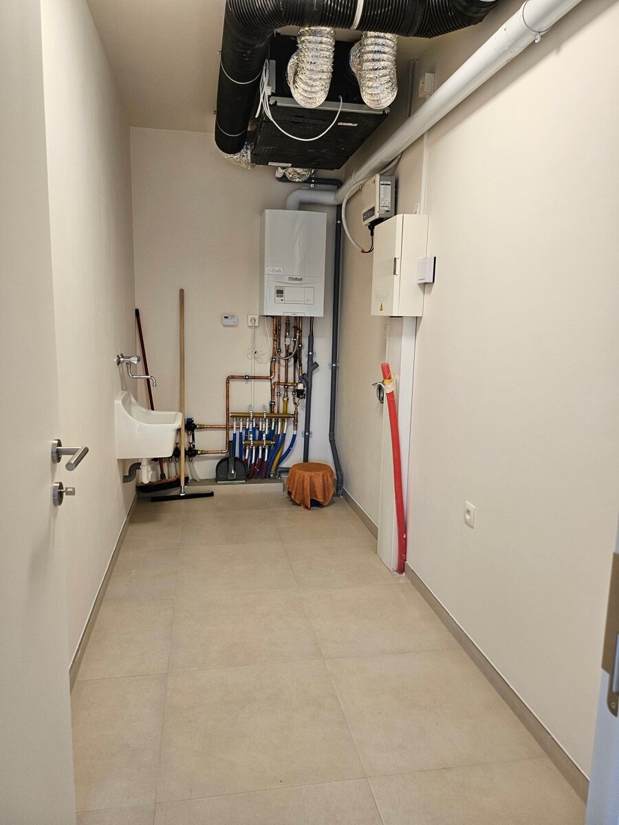 - Berging (2,00m x 4,00m = 8,00m²): aansluiting wasmachine/droogkast, elektriciteitskast, ventilatiesysteem, gasketel, tegelvloer.