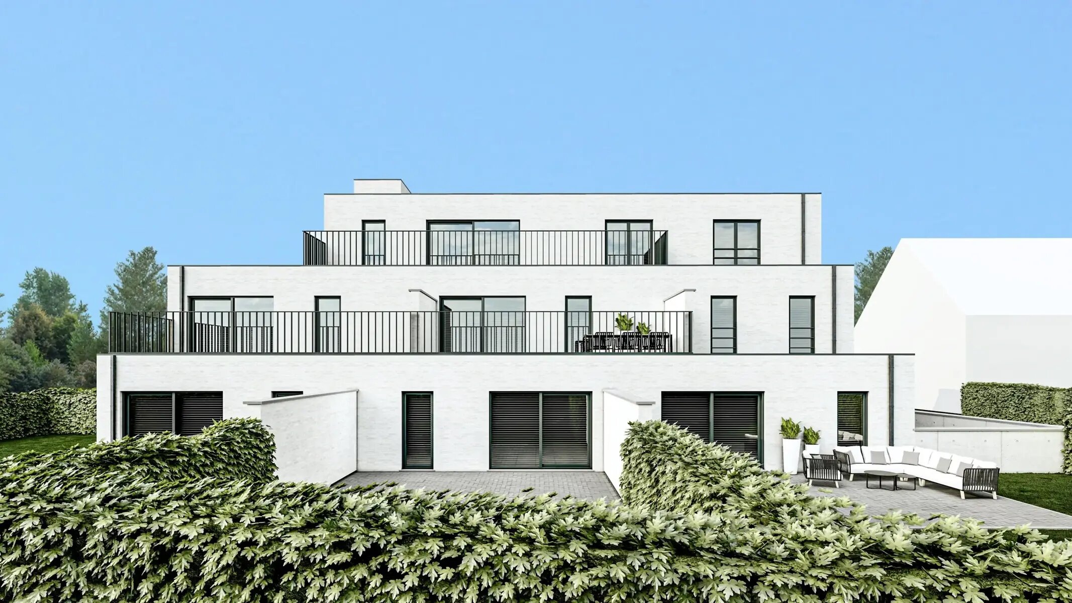 INDELING Op het gelijkvloers bevinden zich 3 appartementen van 106m² en 130m². De gelijkvloerse appartementen hebben naast een ruim terras ook een privatieve tuin. Op de eerste verdieping situeren zich eveneens 3 appartementen met oppervlaktes van 92m² tot 96m², allen met een terras. Op de bovenste (2de verdieping) bevindt zich het penthouse van maar liefst 144m². Alle appartementen beschikken over twee slaapkamers.