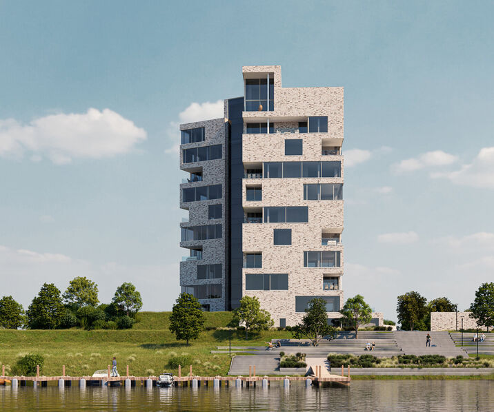 De eerste fase van Nova Eycke – nu in verkoop – bestaat uit 18 ruime, luxueus afgewerkte appartementen, elk met grote leefterrassen en een adembenemend 330° uitzicht over de Maas, het natuurgebied, de nieuwe passanthaven én het charmante stadscentrum van Maaseik.