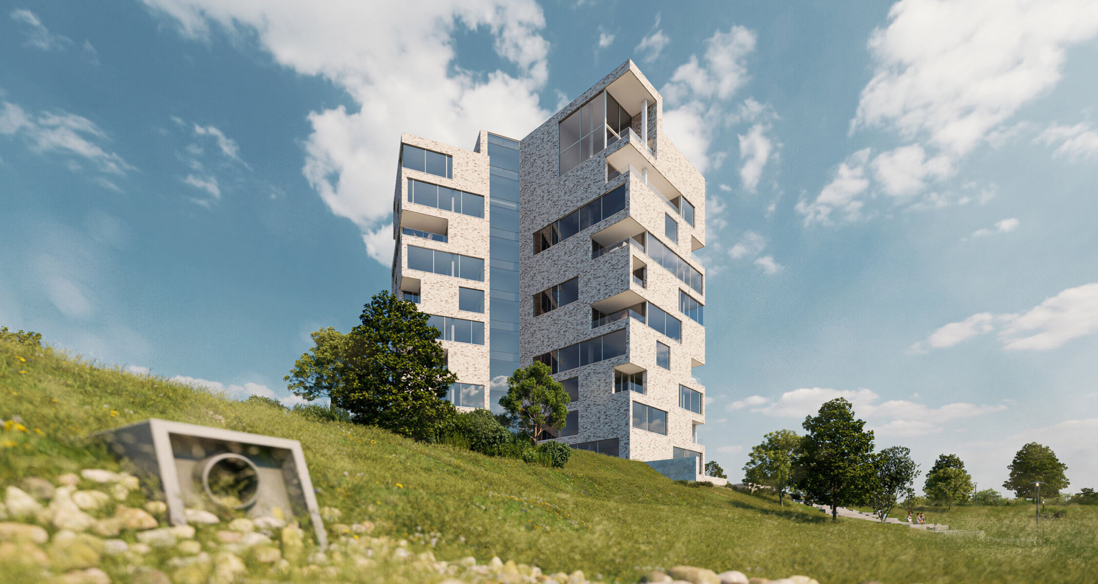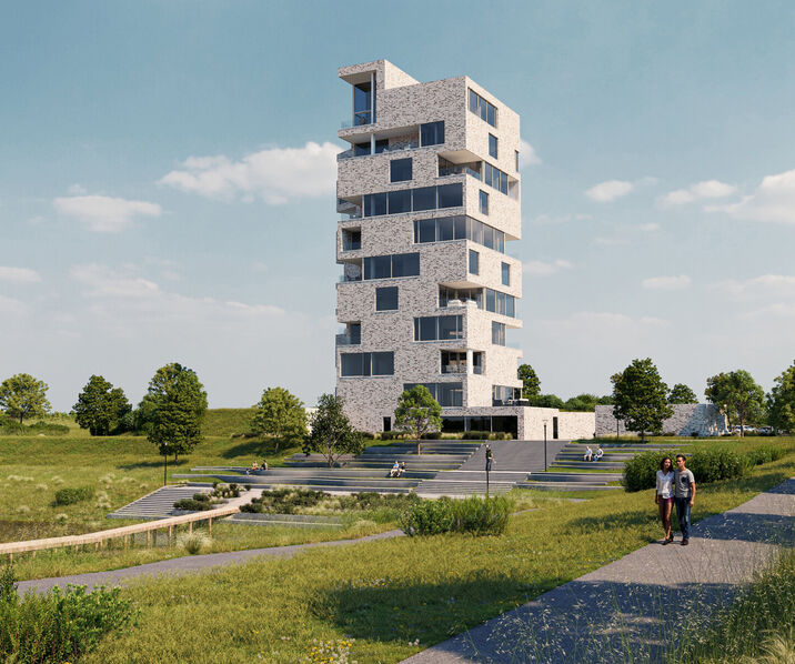 Het architecturaal ontwerp van het appartementsgebouw uit fase 1 is een echt landmark: eigentijds, krachtig en verfijnd, en ontworpen om perfect op te gaan in het landschap. Dankzij de verhoogde liging en open zichtlijnen ervaart elke bewoner hier dagelijks het gevoel van ruimte, licht en exclusiviteit.
