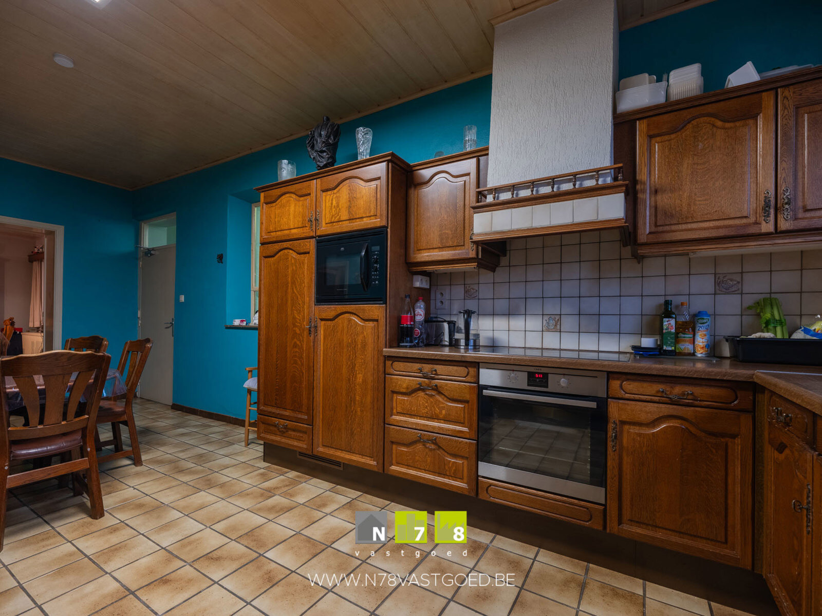 - Keuken (7,00m x 3,50m = 24,50m²): onder- en bovenkasten, lades, kolomkast, keramische kookplaat, gasvuur, dampkap, oven, microgolfoven, koelkast, vaatwasser, tegelvloer.