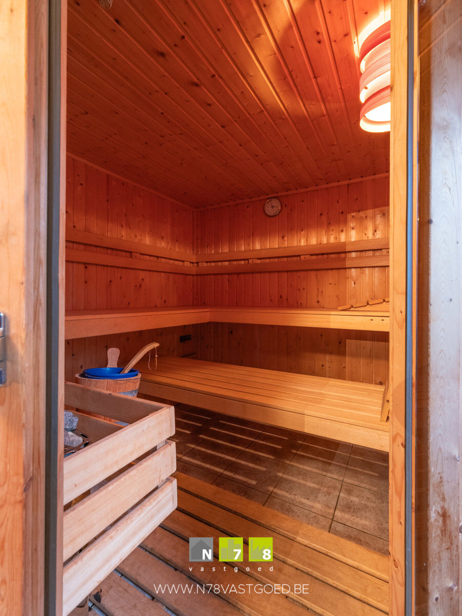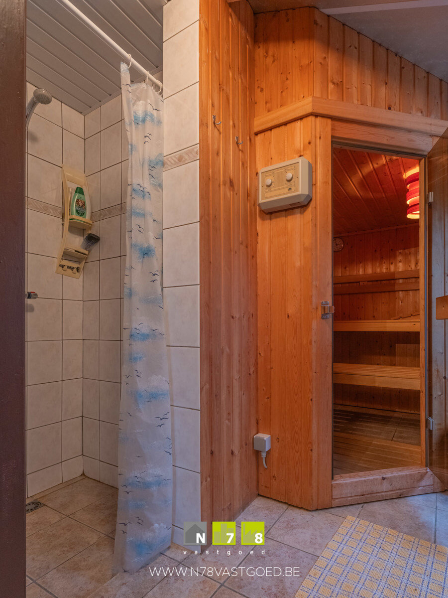 - Saunaruimte (3,60m x 2,90m = 10,44m²): douche, sauna, tegelvloer.