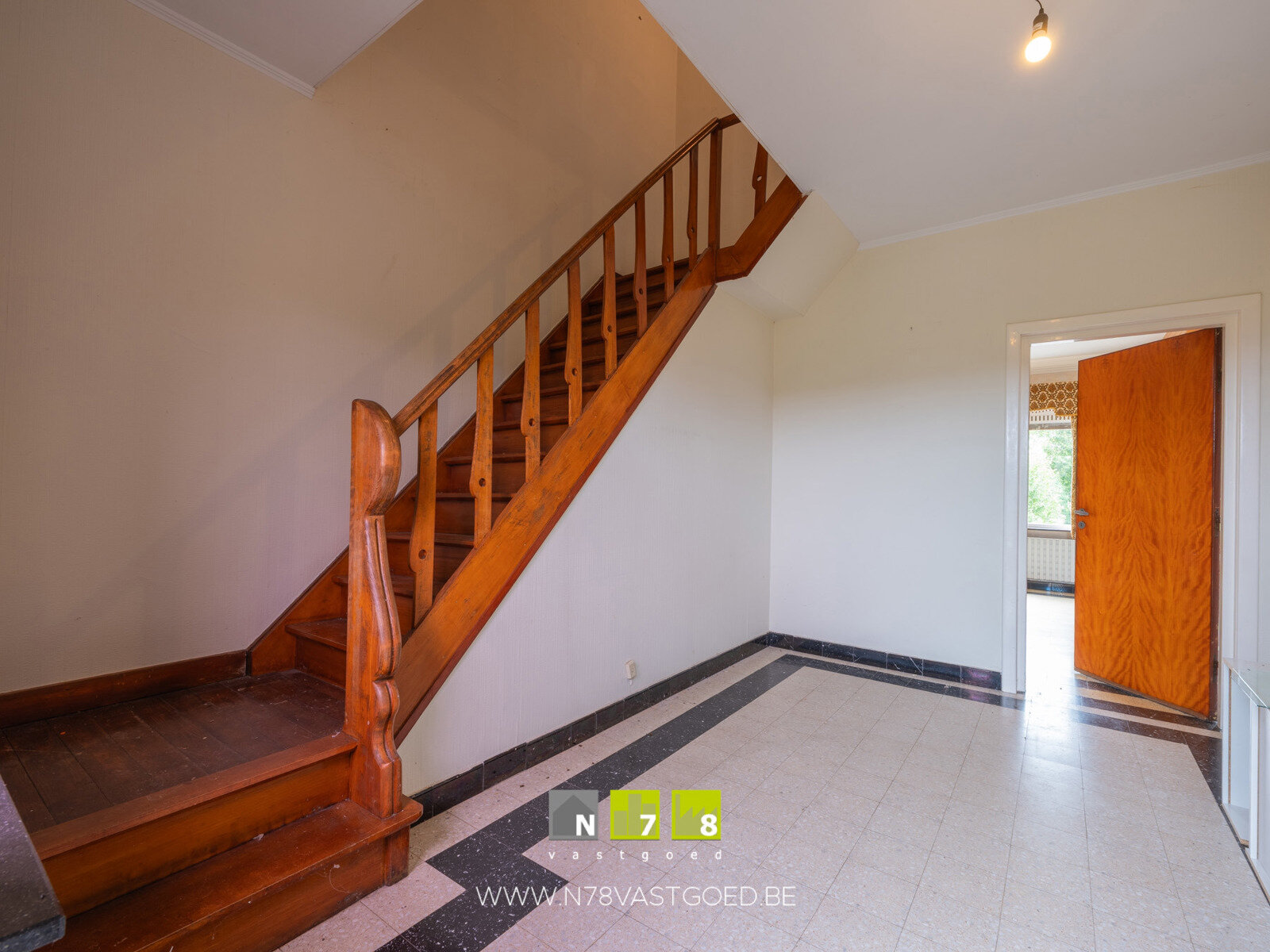 - Inkomhal (2,59m x 3,92m = 10,15m²): houten trap naar eerste verdieping, tegelvloer.
