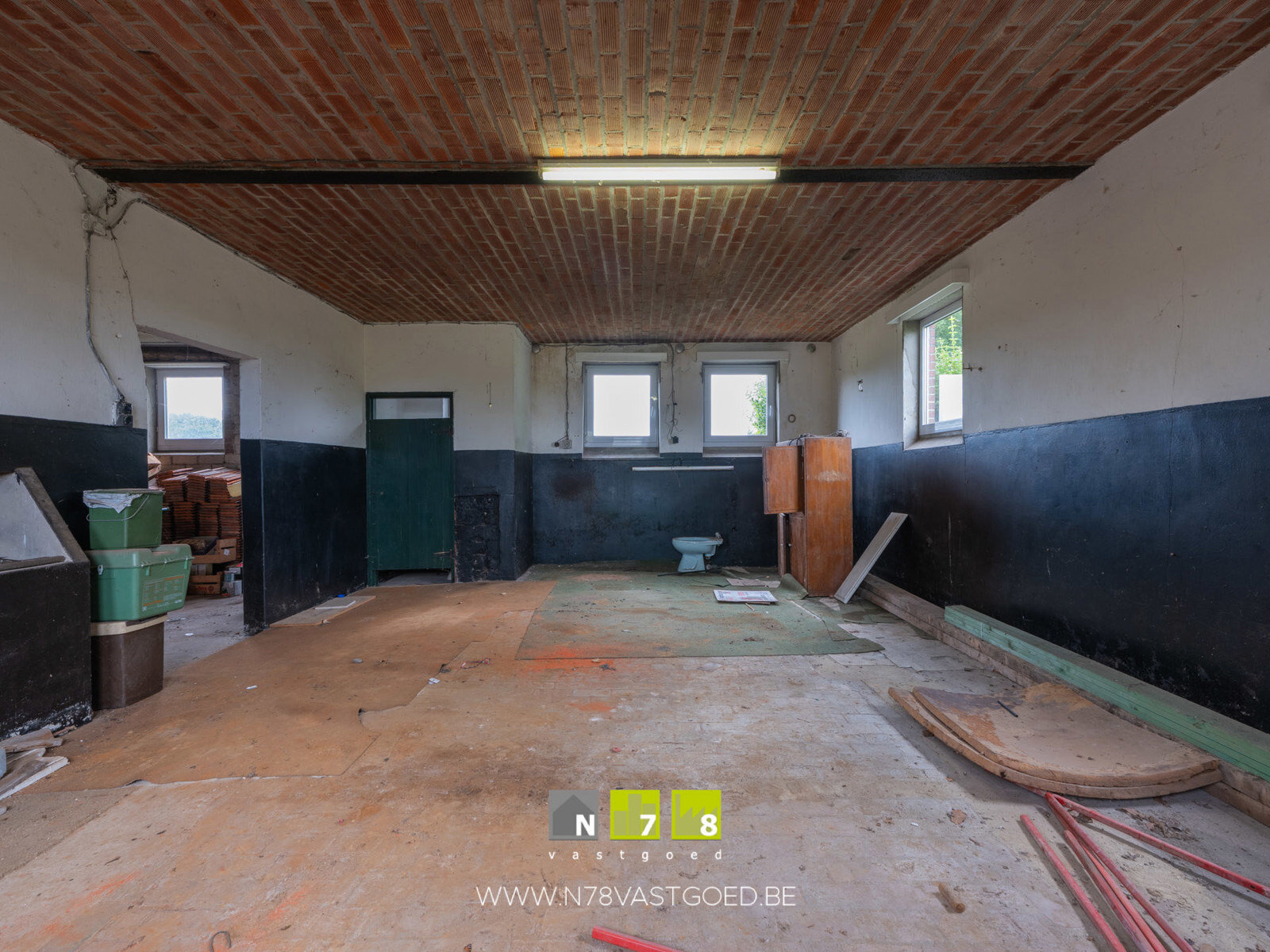 - Stal (4,97m x 7,88m = 39,18m²): mazoutketel, boiler, toegangsluik naar zolder, betonvloer.