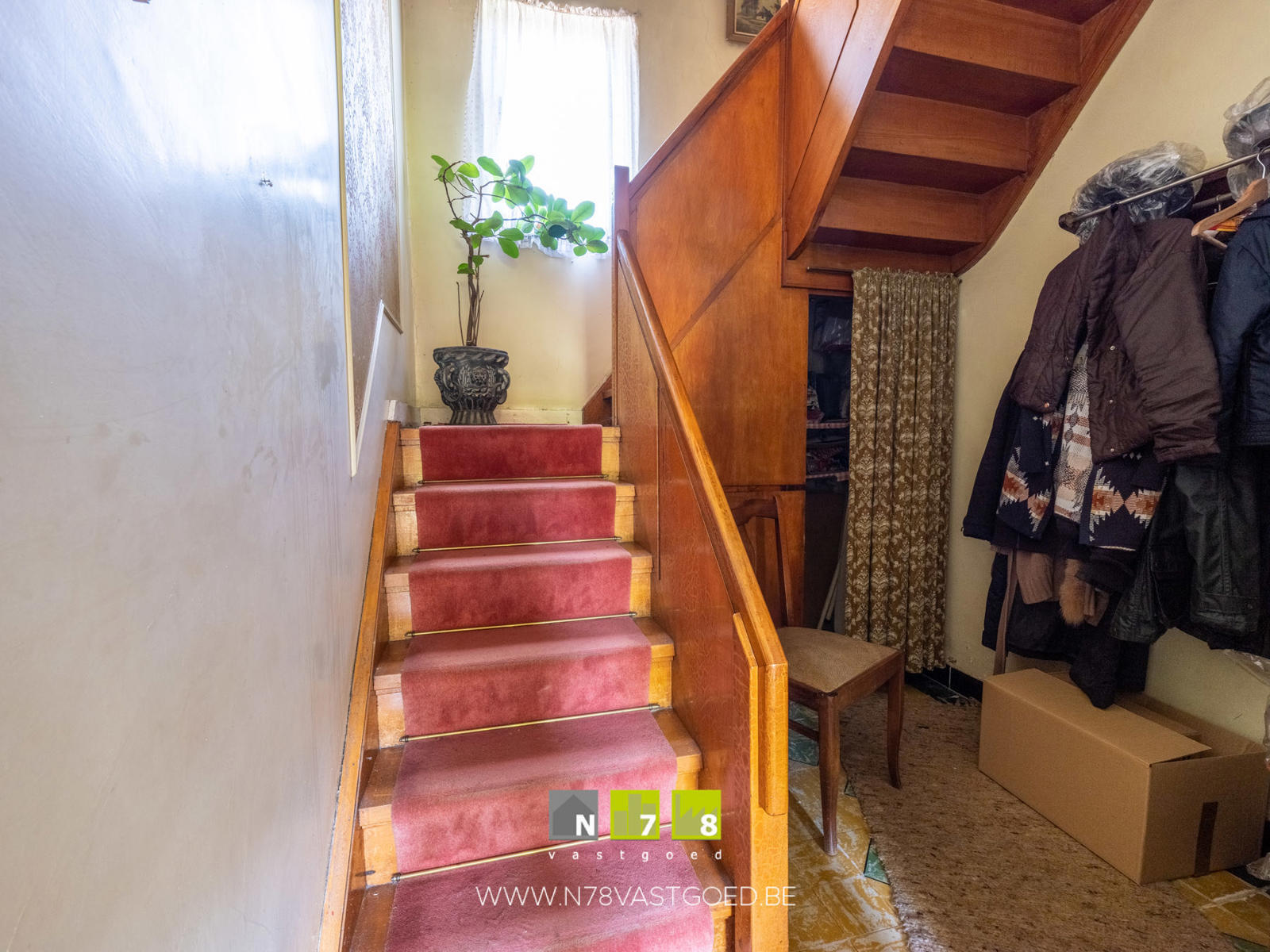 - Trappenhal ((2m x 2,40m = 4,80m²): houten trap naar verdieping, tegelvloer.