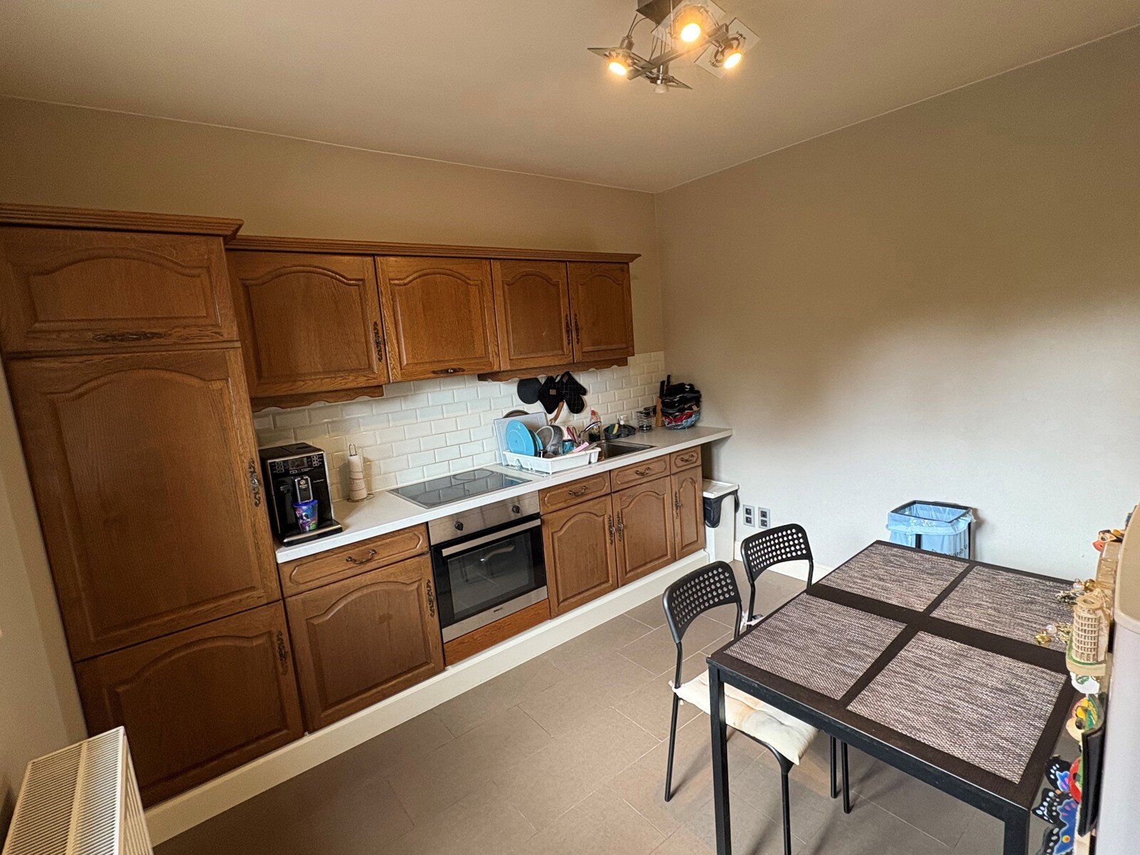 - Keuken (12m²): 3.53x3.45m, geïnstalleerd met lades en kasten, een kookplaat, dampkap, warmeluchtoven en een spoelbak. Tegelvloer.