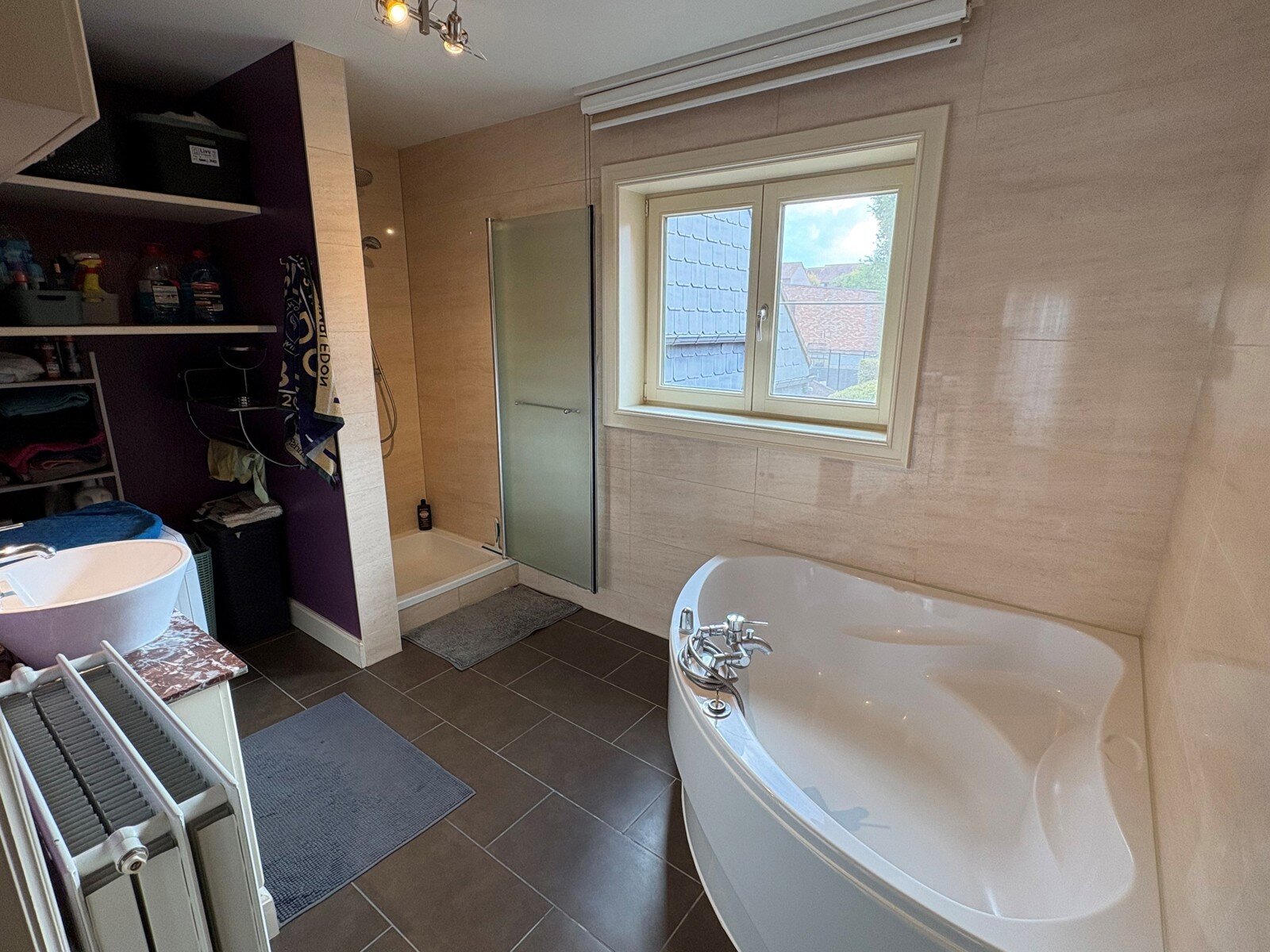 - Badkamer (8m²): 3.73x2.20m, uitgerust met zowel een inloopdouche als een hoekbad en een badkamermeubel met een lavabo en kasten. Voorzien van een raam, aansluiting wasmachine en tegelvloer.