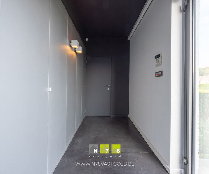 - Inkomhal (3,60m x 1,50m = 5,40m²): inbouwkasten, gepolierde betonvloer.