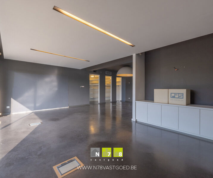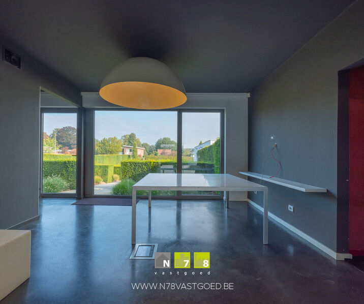 - Bureau/leefruimte ((8,40m x 4,30m) + (2,75m x 4,40m) = 48,22m²): L-vorm, veel lichtinval, gepolierde betonvloer.