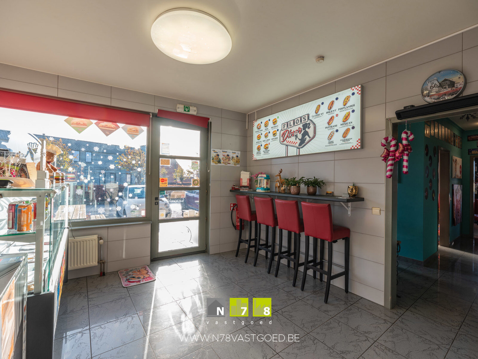 - Handelsruimte (3,80m x 6,40m = 24,32m²): voorheen ingericht geweest als frituur, doorgang naar terras aan de voorzijde, wandbetegeling, tegelvloer.