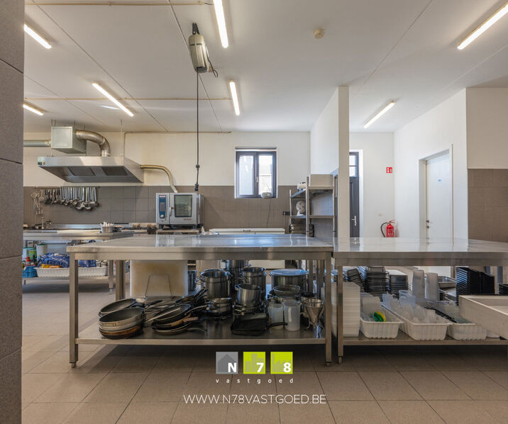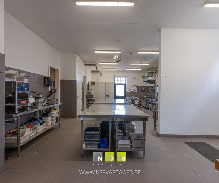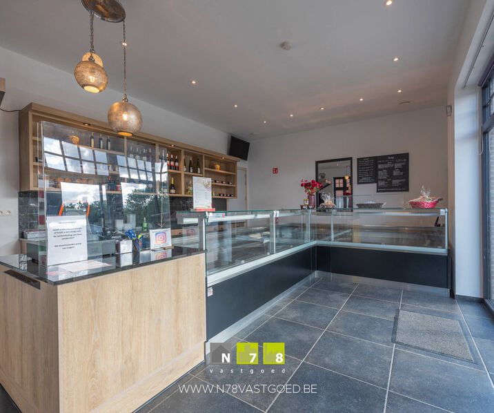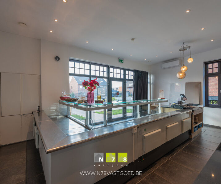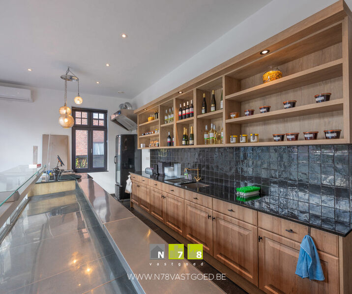 - Winkelruimte (32,20m²): ingericht met keukenmeubel, onderkast & lades, lavabo, airco, tegelvloer.