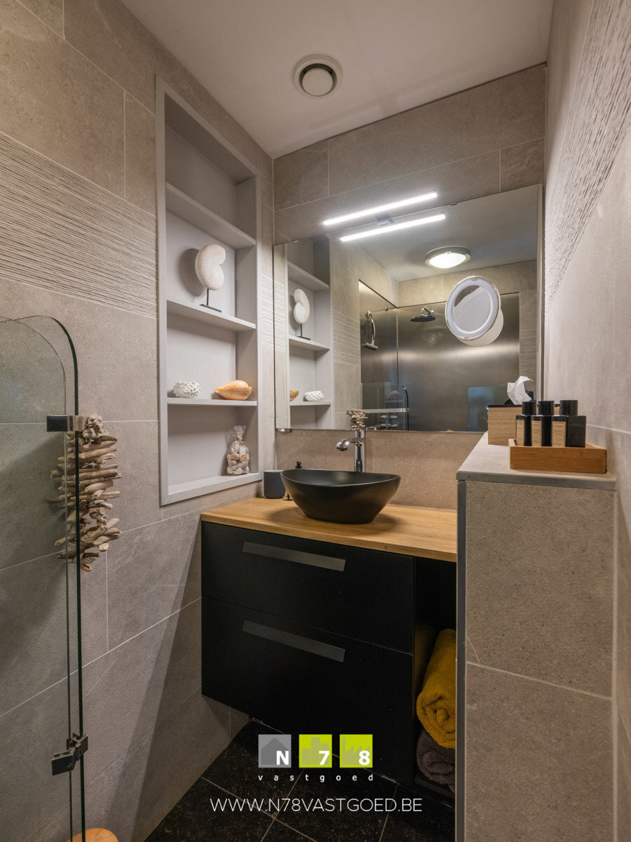 - Badkamer (3,00m x 1,70m = 5,10m²): ingericht badmeubel met dubbele lavabo, lades, kolomkasten; douche, deels wandbetegeling, tegelvloer.