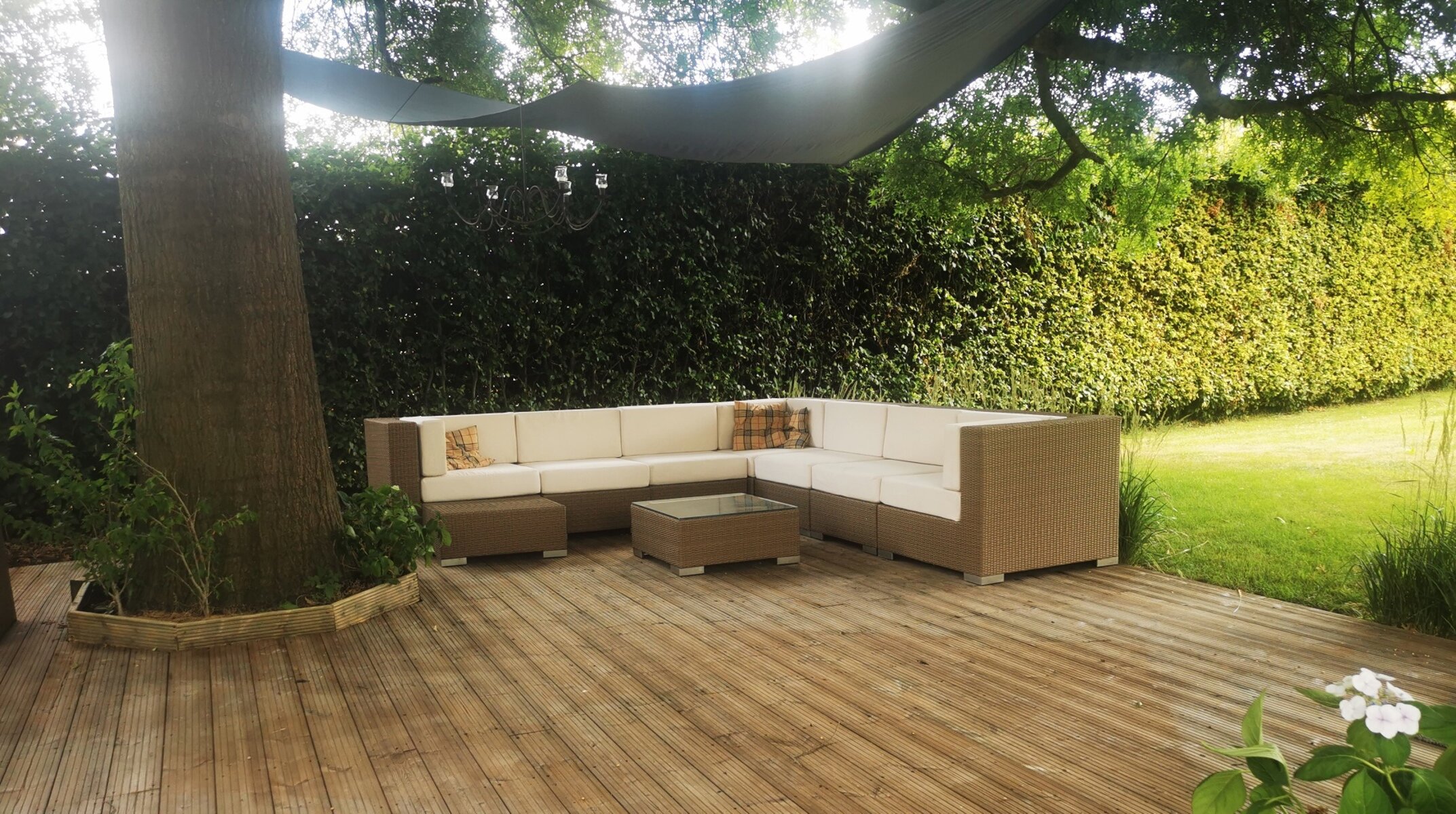 - Terras 1 ((3,30m x 9,00m) + (3,20m x 10,00m) = 61,70m²): volledig rondom de woning, prachtig uitzicht naar de tuin, tegelvloer.