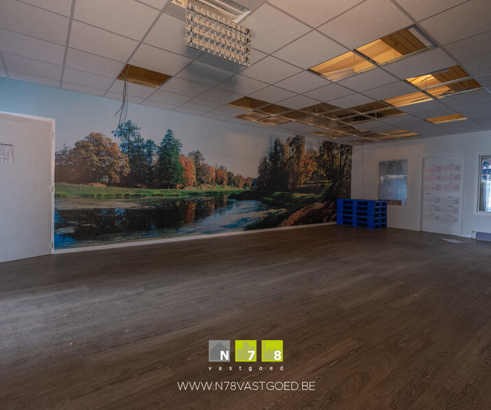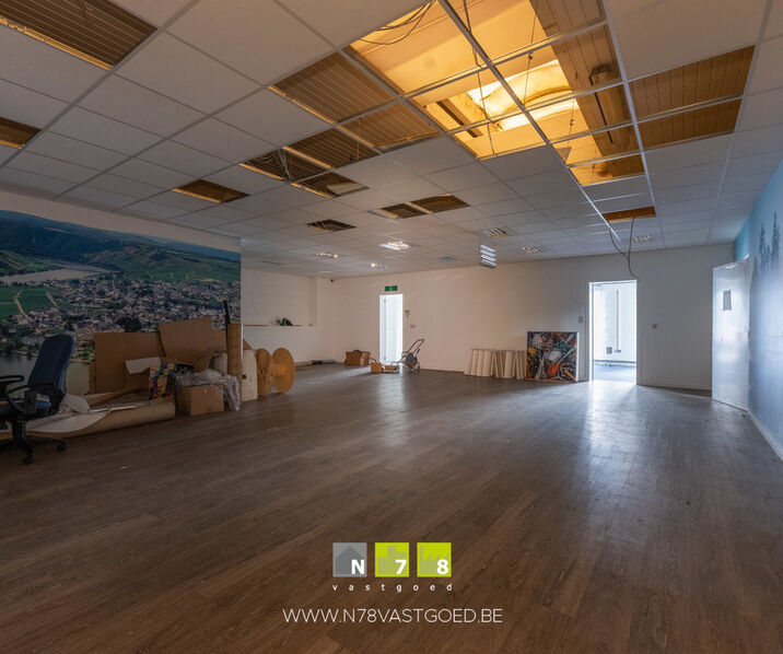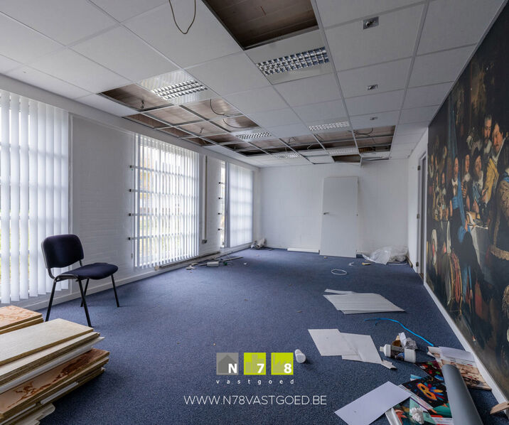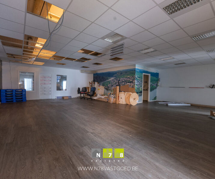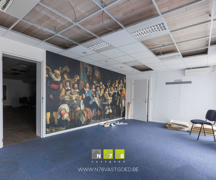 - Kantoor 2 (8,30m x 9,95m = 82,59m²): ruim kantoor, toegang tot de hal, airco, laminaat.