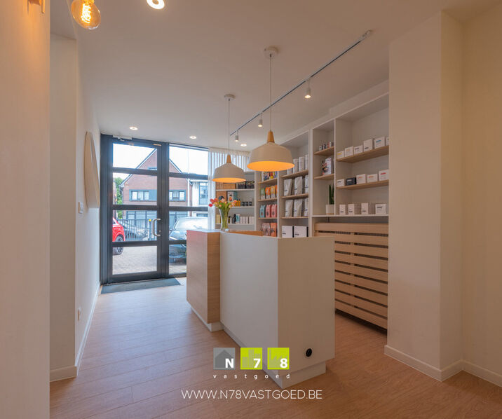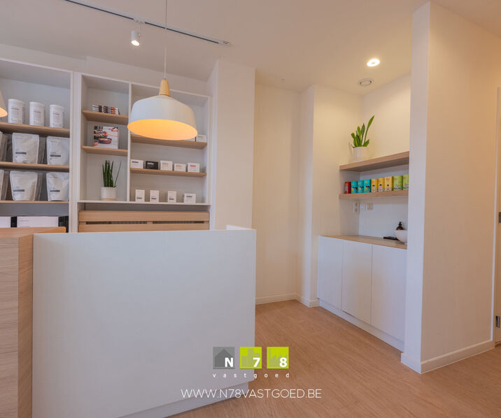 - Onthaal / ontvangstruimte (2,75m x 5,60m = 15,40m²): verkoopbalie, inbouwkasten, leggers, spoelbakje met onderkasten, laminaat.