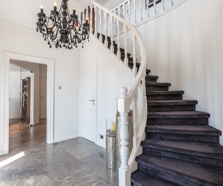 - Inkomhal (3,50m x 3,20m = 11,20m²): trap naar verdieping -1 & +1, marmeren vloer.