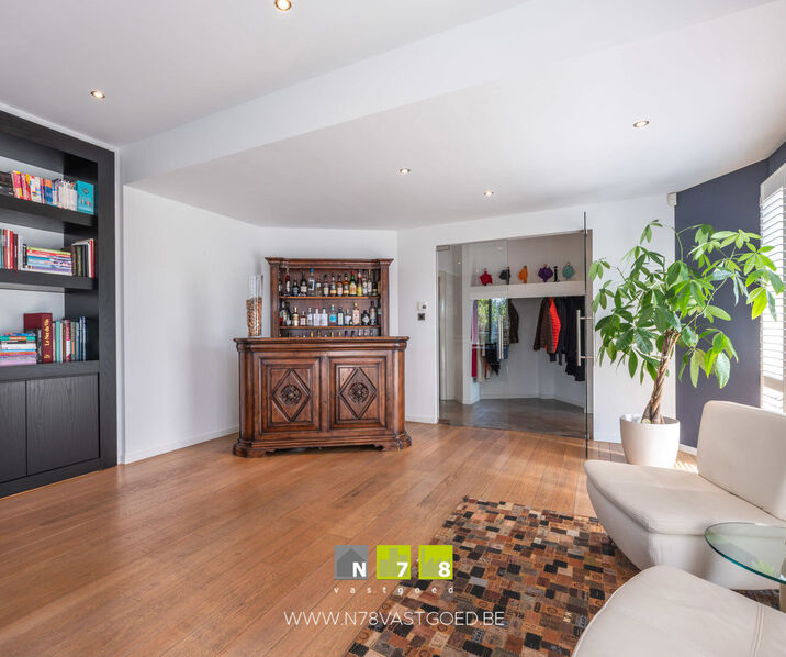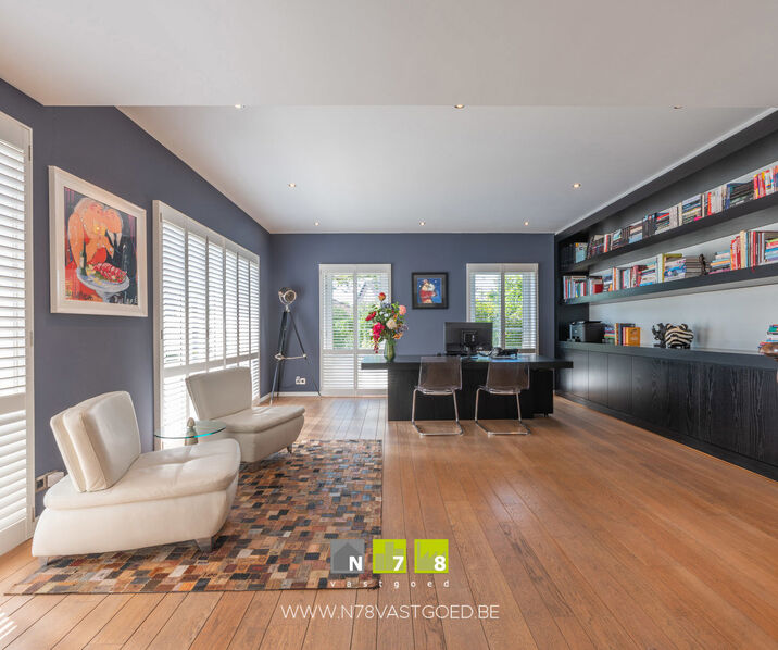 - Kantoor/polyvalente ruimte (6,00m x 7,00m = 42,00m²): aparte zij-ingang, inkomhal, inbouwkasten, ingebouwde luidsprekers, dimbare inbouwspots, alarminstallatie, PVC-vloer