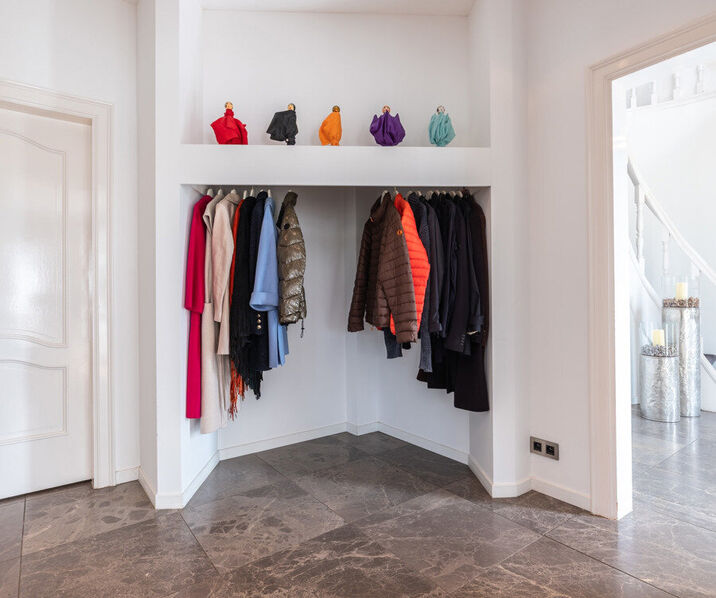 - Hal (3,75m x 2,30m = 8,63m²): vestiairehoek, marmeren vloer.
