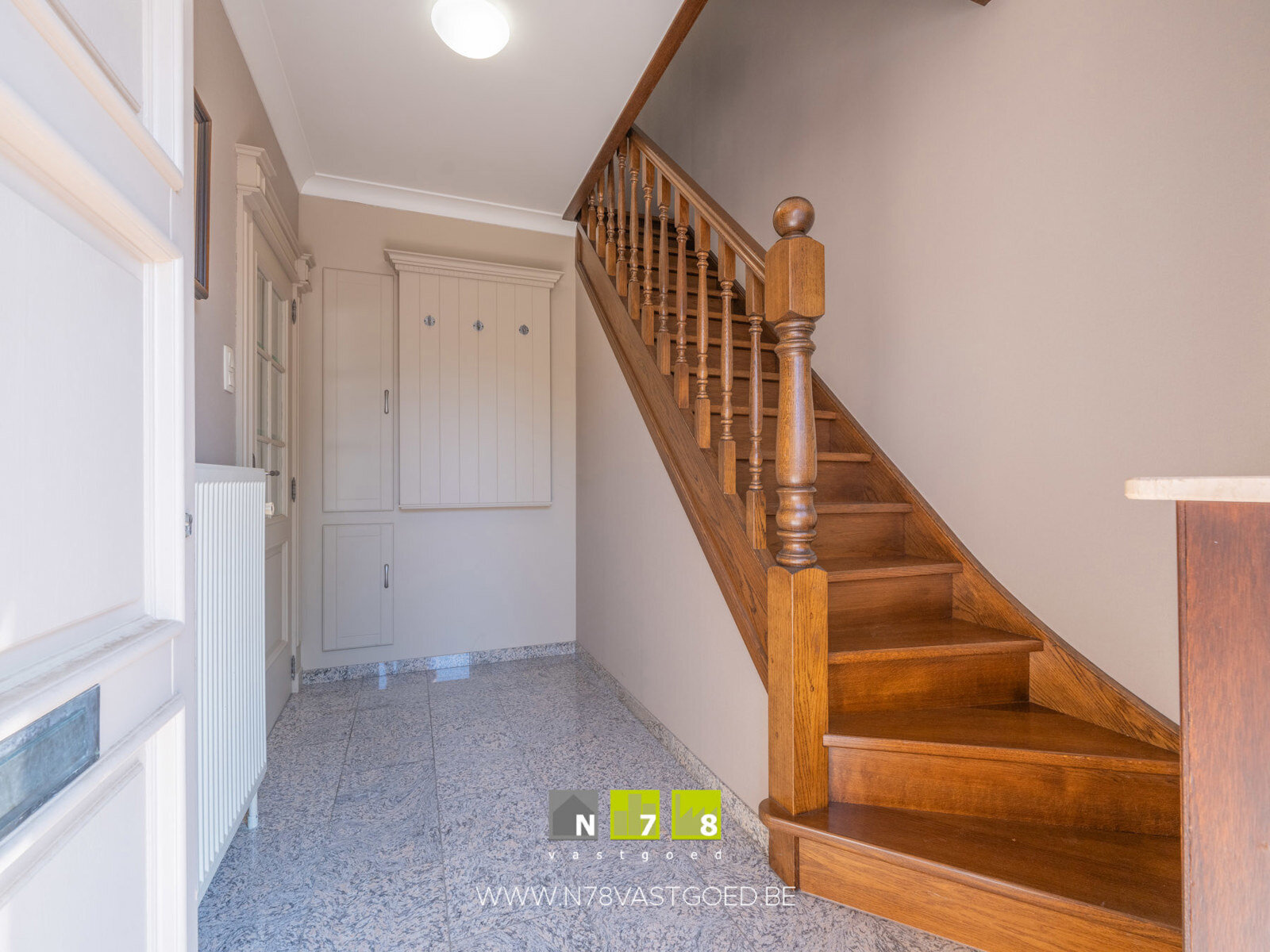 - Inkomhal (3,10m x 2,30m = 7,13m²): eiken trap naar verdieping 1, granieten vloer.
