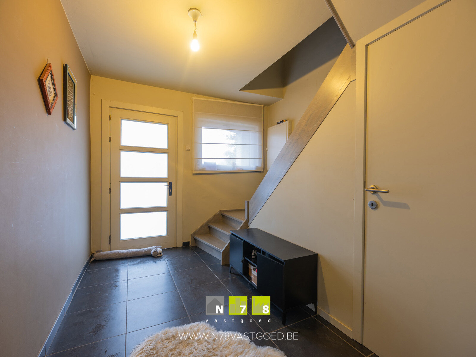 - Inkomhal ((1,02m x 3,57m) + (2,17m x 3,56m) = 11,3m²): tegelvloer.