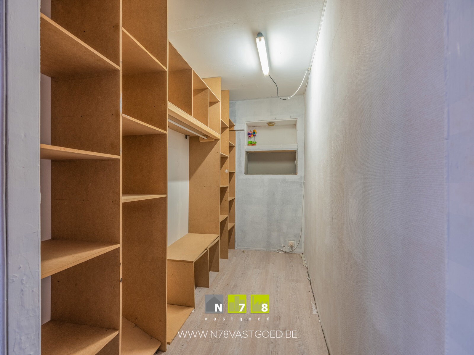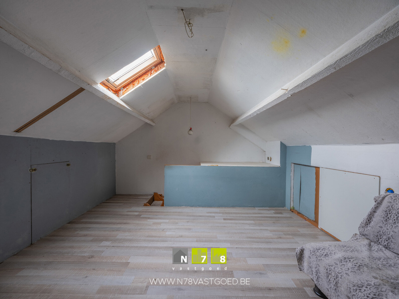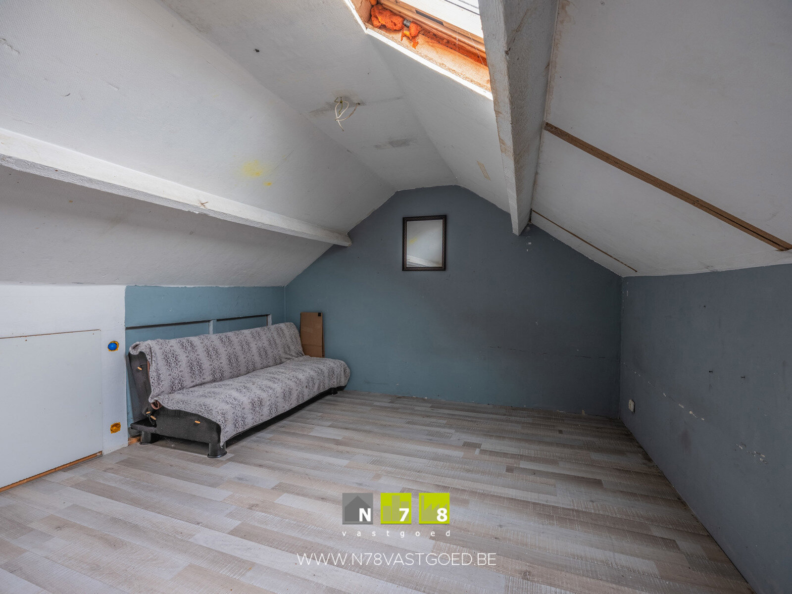 - Bergplaats (2,62m x 3,99m = 10,45m²): mogelijkheid tot installatie van toilet, laminaat.