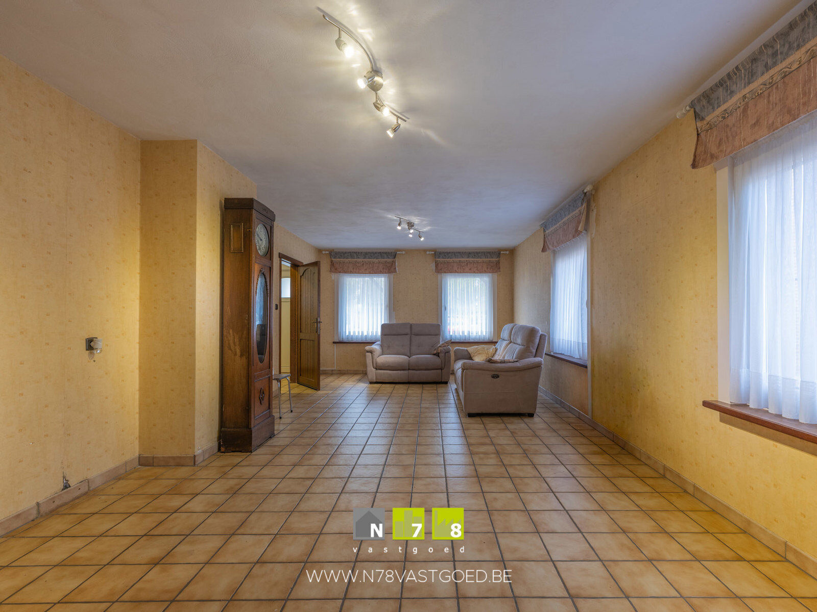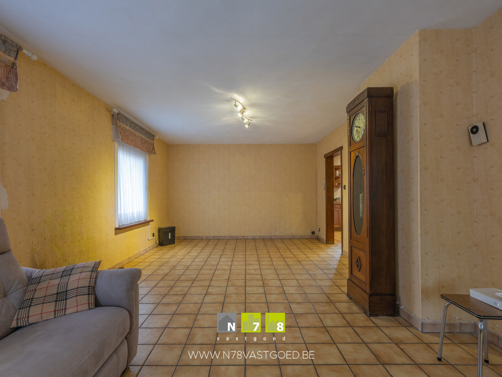 - Woonkamer (3,91m x 7,96m = 31,12m²): tegelvloer.