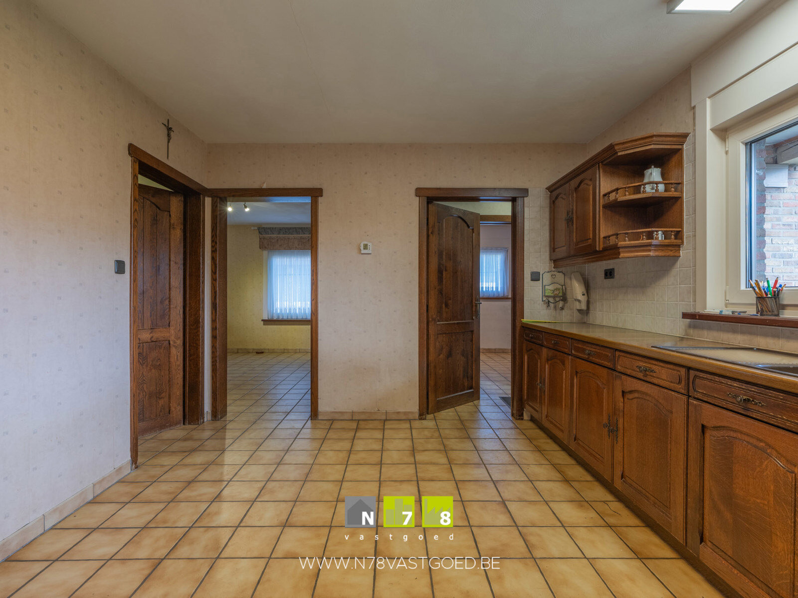 - Keuken (3,42m x 4,40m = 15,05m²): onder- en bovenkasten, lades, keramische kookplaat, dampkap, oven, koelkast, vaatwasser, tegelvloer.