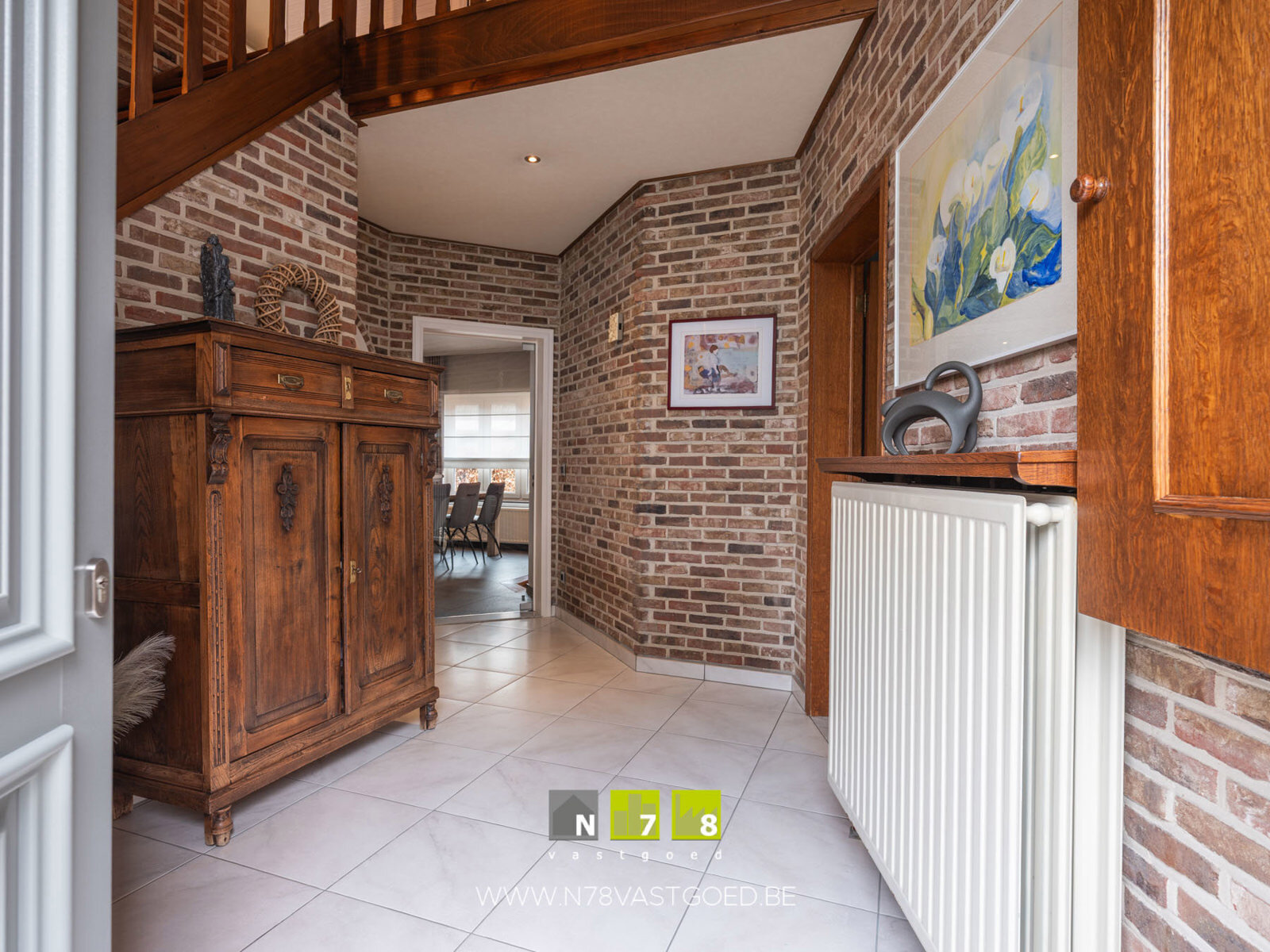- Inkomhal (3,85m x 3,20m = 12,32m²): trap naar verdieping 1, tegelvloer.