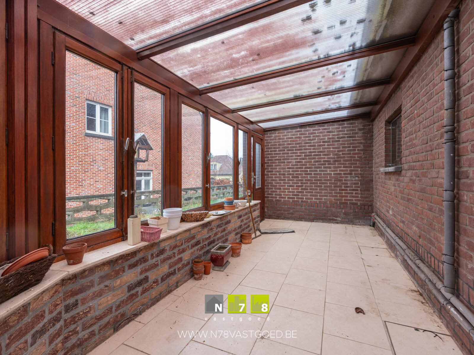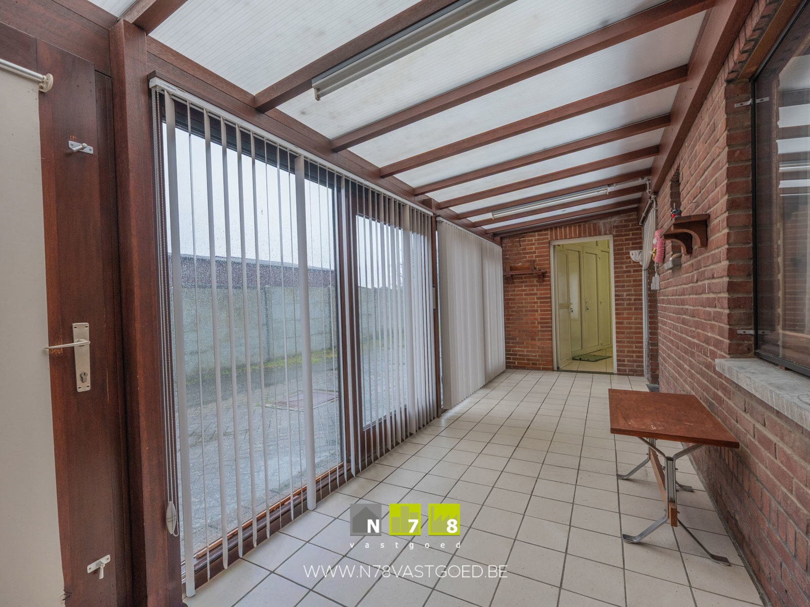- Veranda (6,50m x 2,00m =13,00m²): ingang keuken, ingang achterbouw, schuifraam, tegelvloer.