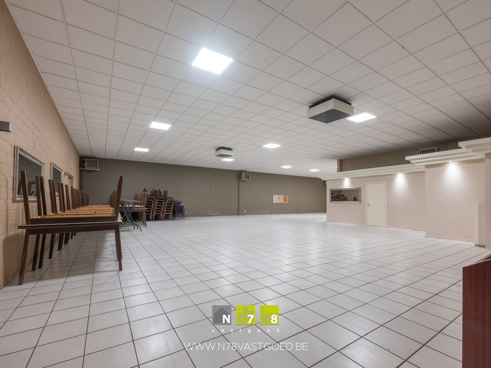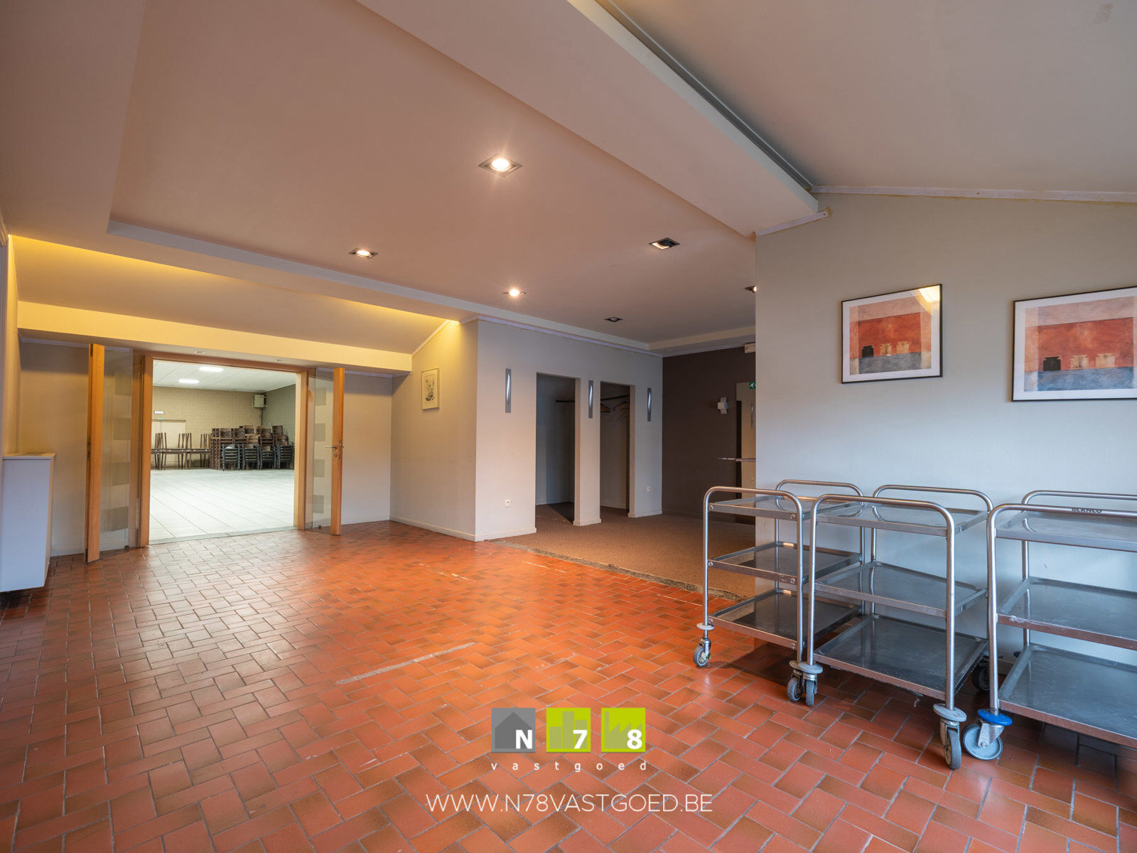 - Inkomhal (7,9m x 7,47m = 59,0m²): vestiaire (7m²), ruime ontvangstplaats, doorgang naar feestzaal en restaurant.