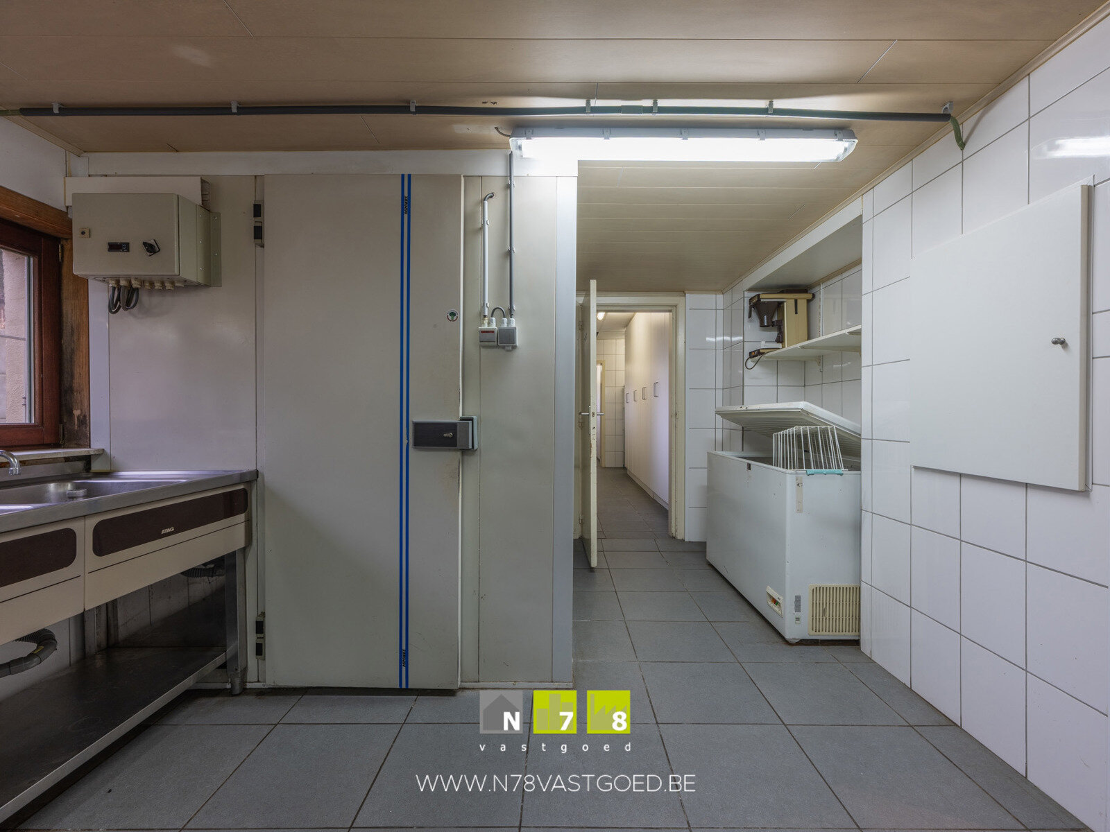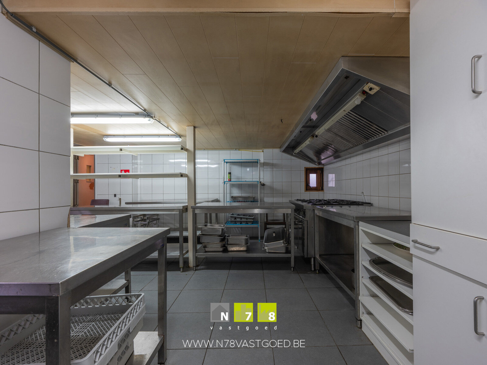 - Keuken ((3,37m x 6,88m) + (3,48m x 2,59m) + (3,21m x 2,84m) = 41,3m²):k oelcel, aluminium werktafels en spoelbakken, doorgang naar feestzaal en restaurant, tegelvloer.