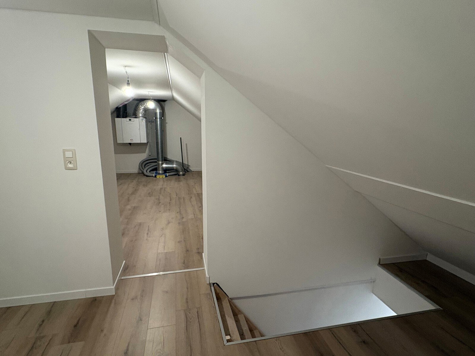 VERDIEPING +02 - volledig vernieuwde houten tussenvloer: - Zolder (51m²): 8.50x6.00m, bereikbaar via een vaste trap en afgewerkt. Volledig nieuw dak met 24cm isolatie. Hier hangt ook het ventilatiesysteem type D met warmterecuperatie. Laminaatvloer. EXTERIEUR: - Doorgang: de doorvaart voor de voordeur naar de achtergelegen woning hoort ook bij deze eigendom.