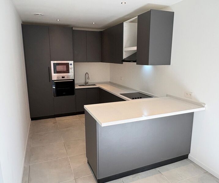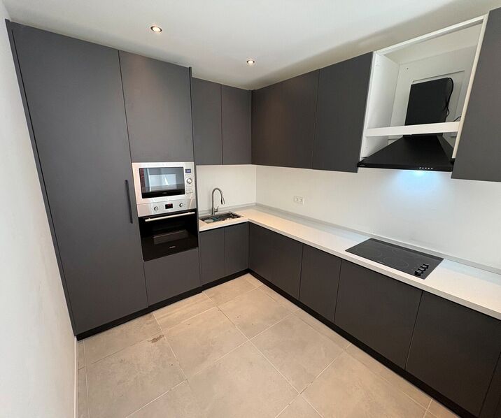 - Keuken met eetplaats (18m²): 7.00x2.60m, geïnstalleerd met boven- en onderkasten, een granieten werkblad, een ingebouwde koelkast