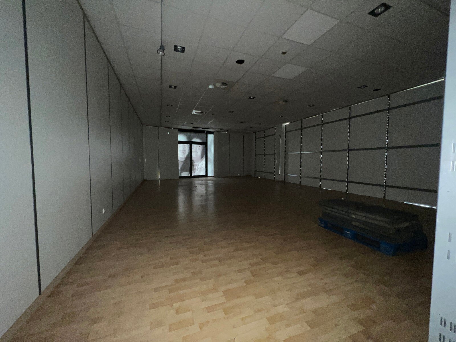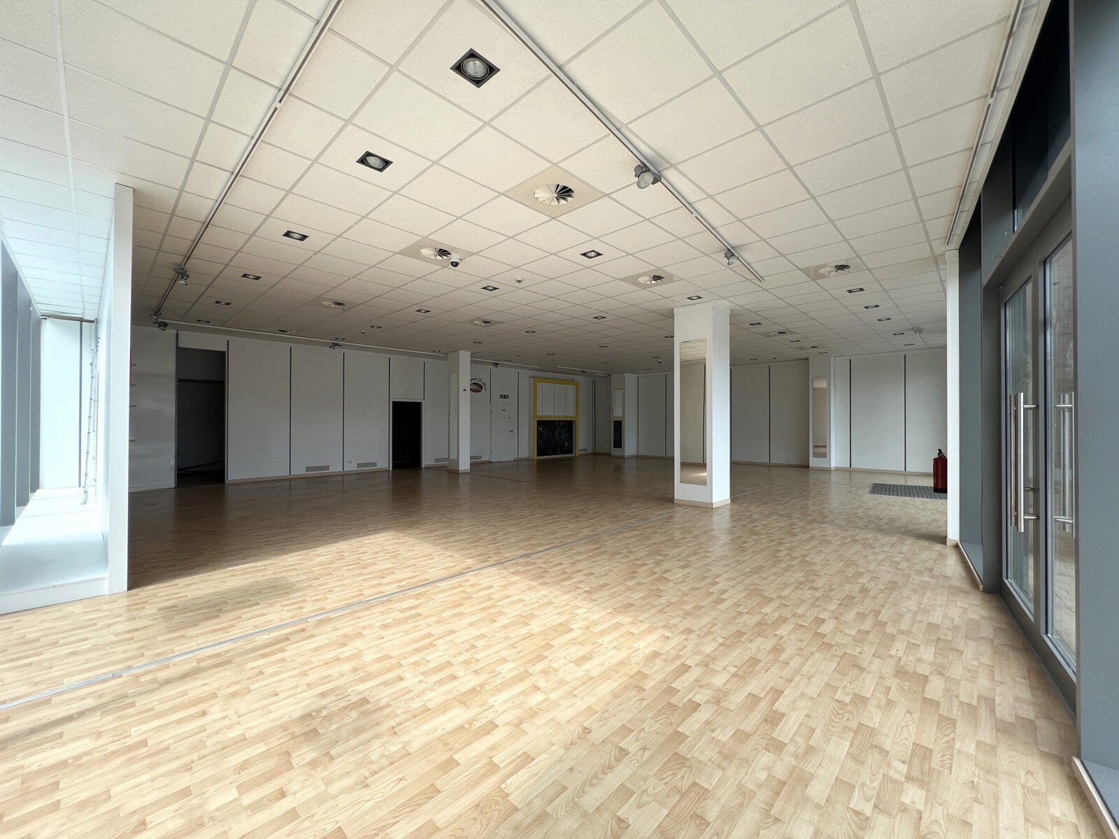 - Winkelruimte (8m x 12,20m = 97,60m²): verlaagd plafond, 2 ingangen, laminaat.