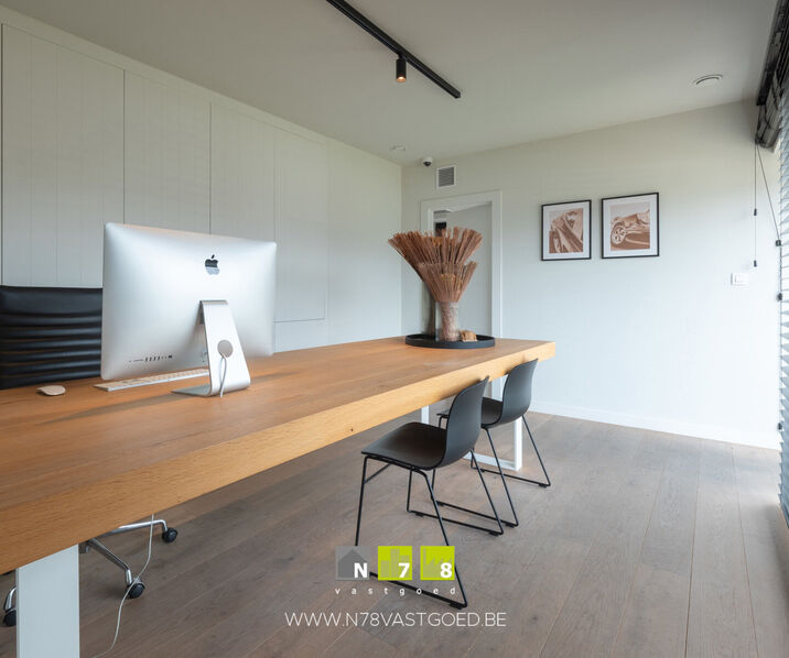 - Bureel (3,80m x 4,78m = 18,16m²): inbouwkasten, camera-bewaking, parketvloer.