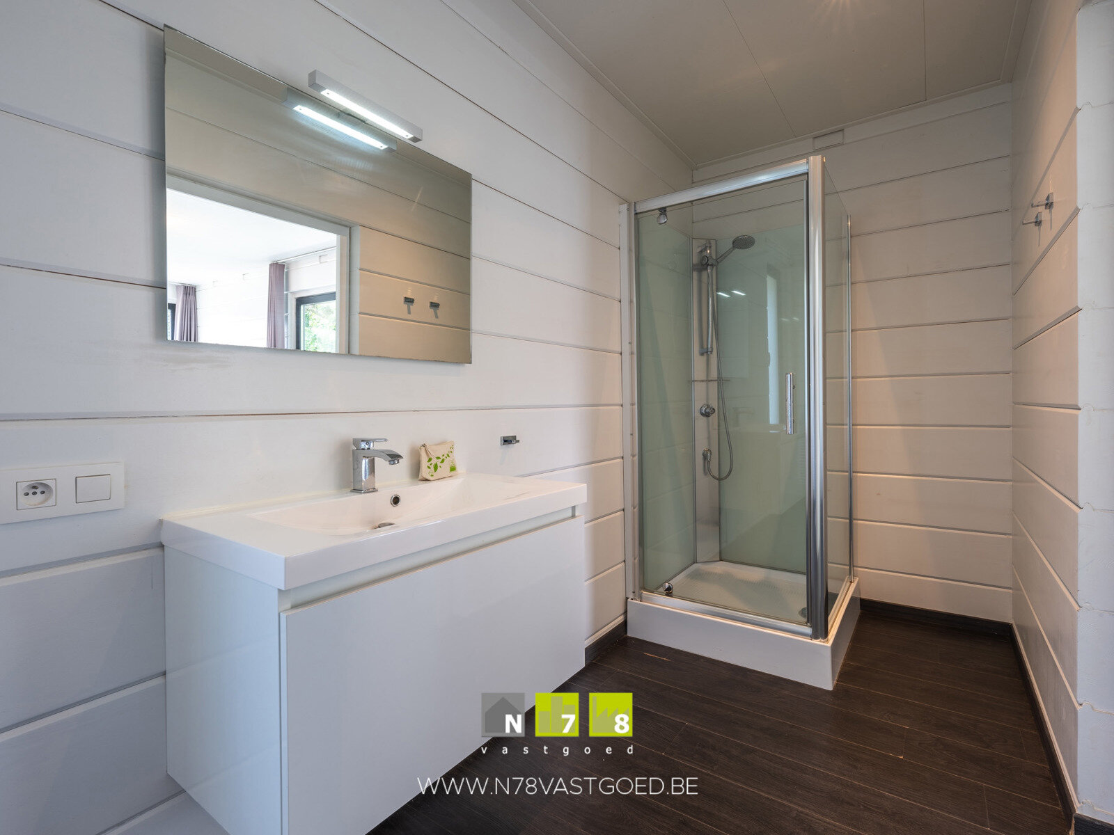 - Badkamer 2: badmeubel met enkele lavabo, onderkast, spiegel, douchecabine, hangtoilet, laminaat.