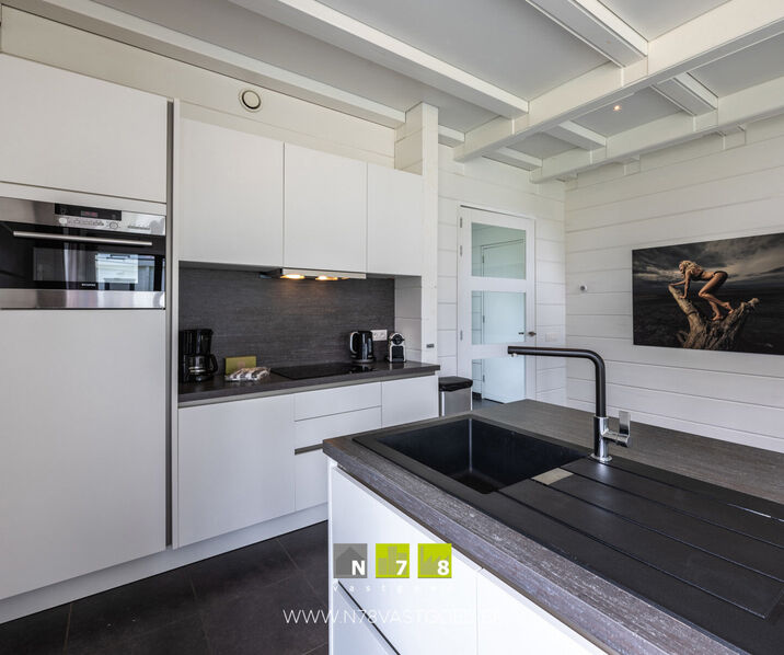 - Open keuken in woonkamer: geïnstalleerd met onder-bovenkasten, lades, inductieplaat, dampkap, combi-oven, koelkast, vaatwasser, ziteiland met spoelbak + lades, tegelvloer.